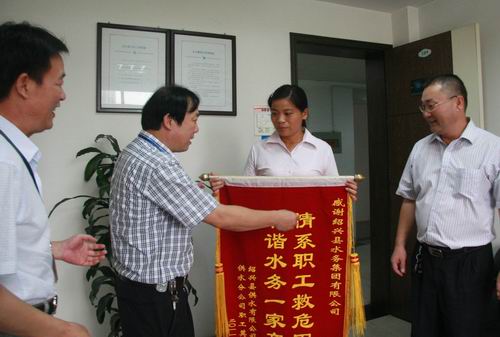 8月17日,家庭遭受火灾的供水公司分公司职工莫煜君在分公司负责人及村支书的陪同下来到星空(中国)公司送上一面“情系职工救危困,和谐水务一家亲”锦旗,感谢星空(中国)工会对其的帮助。