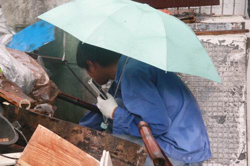 又抄了几十只表,小吴来到一个木板、破家具等杂物的角落,把一张破竹椅拿开,又把一块木板移开,然后蹲下身去拨弄起来,过了一会离开了。我说,你在找什么?他说,这下面有只表要抄,这户人家把装水表的位置作堆积场所了,不好抄。