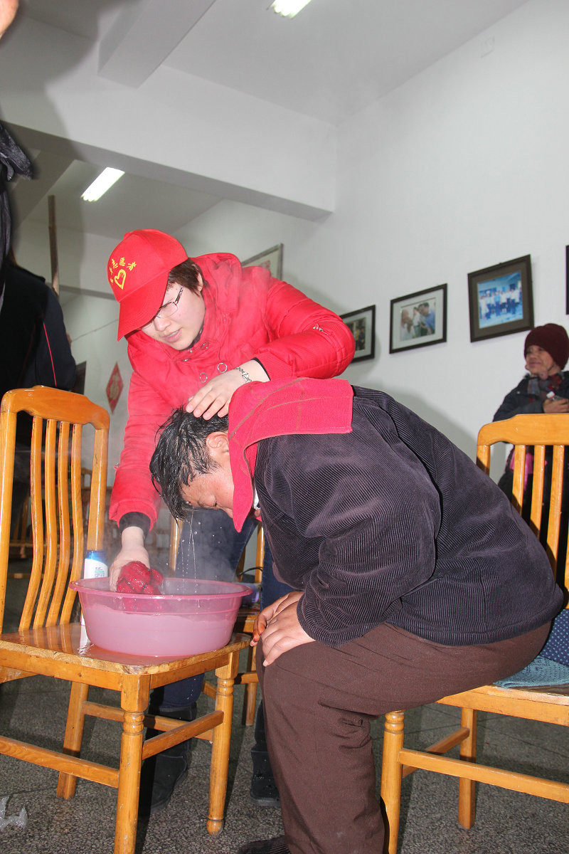 图为星空(中国)志愿者正在为柯桥夕阳红中心老人洗头
