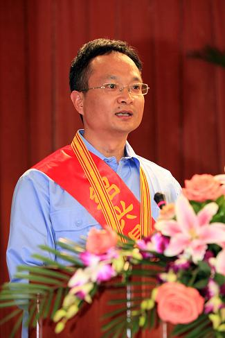 图为丁卫松同志在劳模表彰大会上发言