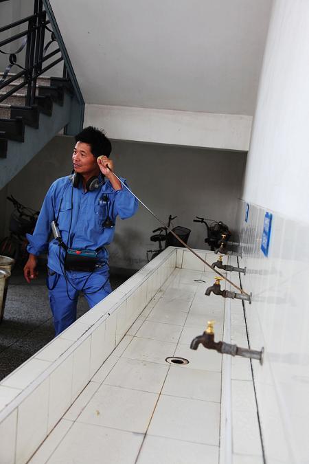 图为供水公司听漏人员对学校供水管道进行听漏