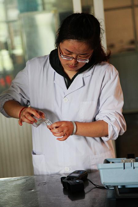 图为供水公司水质化验员对学校内管网水进行现场检测化验