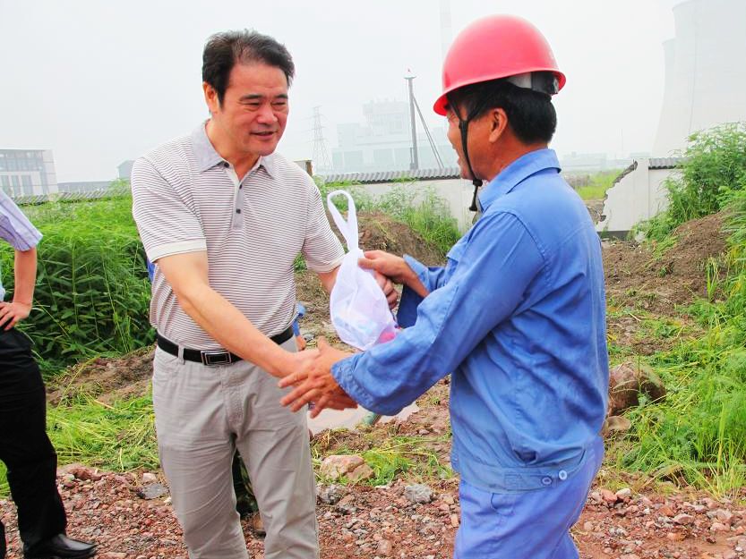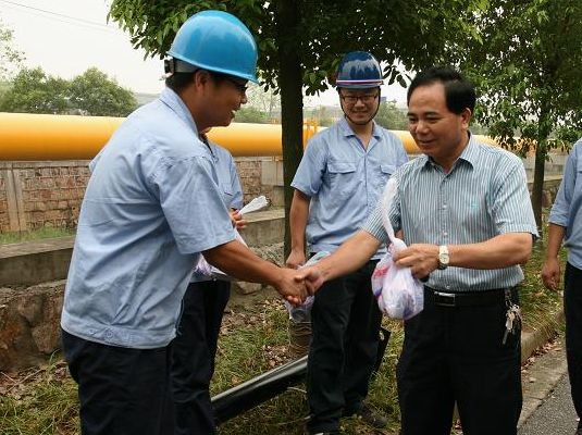 图为星空(中国)倪董事长慰问滨海供水管道安装现场员工