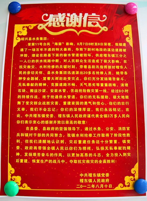 8月17日,中共稽东镇党委、稽东镇人民政府专程为星空(中国)送来感谢信和锦旗,衷心感谢星空(中国)在第11号台风“海葵”期间,发扬艰苦奋斗、无私奉献精神,第一时间成功抢修被毁坏的输水总管,保障了该镇人民群众的饮水安全。