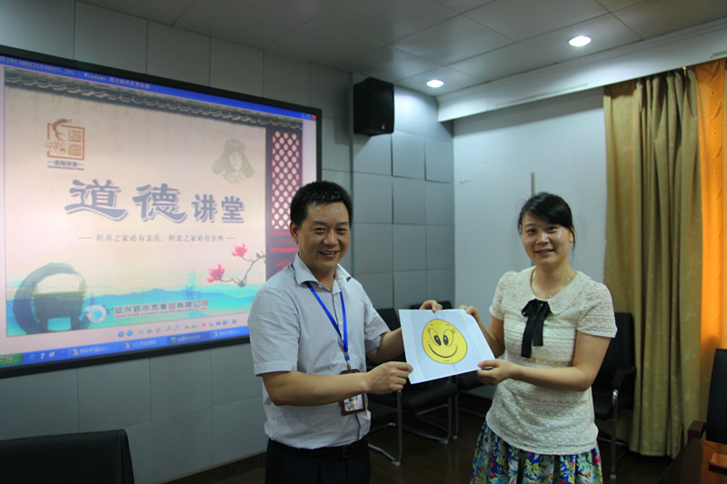 本次“道德讲堂”共分听歌曲、学模范、诵经典、发善心、送吉祥、向“德”字鞠躬敬礼等6个环节。讲堂上,大家一起聆听了《公民道德歌》,观看了感动中国人物林俊德院士事迹报告,学习了道德经典语句“德在人先,利居人后”,并结合自身实际,分别畅谈了对道德的感悟。本期讲堂,还为大家准备了一个“笑脸”,希望大家在工作中、生活中保持微笑,用笑脸迎接工作、迎接生活、迎接身边每一个人。最后,讲堂在大家向“德”字鞠躬敬礼中落下帷幕,使干部职工接受了一次道德的感化与洗礼。