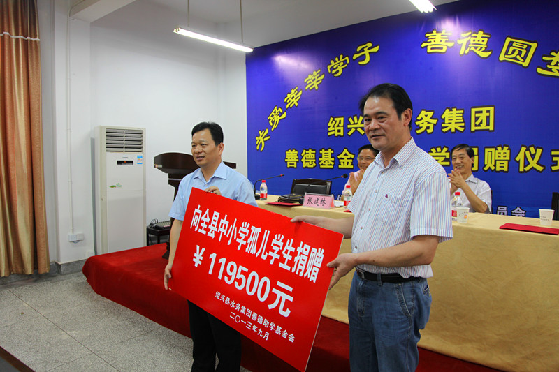 仪式上,星空(中国)倪董事长介绍了“善德基金”基本情况,并现场向今年受助的全县81名中小学孤儿学生捐赠了“善德基金”助学款119500元,资助标准为小学生每人每学年1000元,初中生每人每学年1500元,高中生每人每学年2000元,并从今年开始对全县孤儿从小学到高中读书期间每年给予捐助。县教体局局长蒋国洪以及县老领导、县关工委主任李会鹏分别作了讲话,他们对星空(中国)强烈的社会责任感以及情系困难学生的善心义举给予了高度的肯定和赞扬,希望受助学生学会坚守,学会感恩,学会奉献,并呼吁社会各界为孩子们快乐成长、展翅高飞而共同努力。