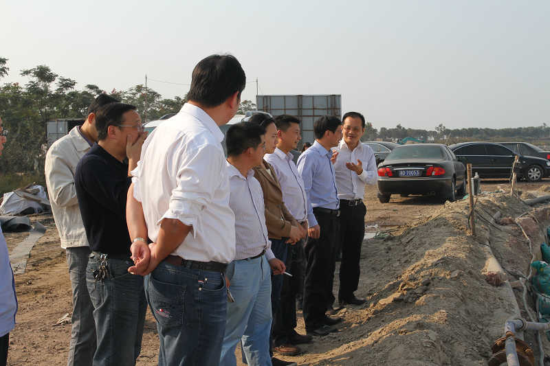图为检查组一行在新建填埋场建设现场进行检查