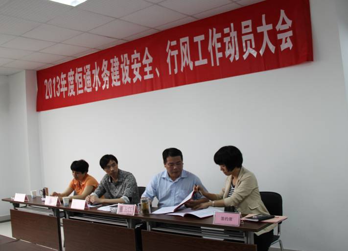 5月17日上午,恒通水务建设公司三楼会议室召开了2013年度安全、行风工作动员大会。会议由公司安全分管领导董副总主持,陈董事长作重要讲话。 会上,董副总列举了8项工作重点,布置了2013年度安全、行风工作,并要求各部室要将安全、行风目标落实到位,责任到人。随后由董副总代表公司与各部室负责人签订了安全、行风目标管理责任书,责任书的签订明确了公司与职工在安全行风建设工作上的职责,强化了双方的责任意识。