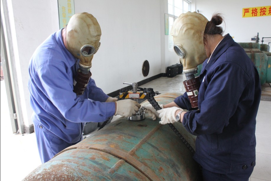 9名员工参与了此次演练。两人一组,从新旧空气呼吸器和防化服的正确穿戴及使用、泄氯堵漏工具的使用以及氯瓶拆装三个项目进行技术演练。演练从实战出发,参演人员各司其职,按照“正确、迅速”的原则,圆满地完成了本次演练任务,最后公司运行部副经理对参演人员按标准进行了评分考核并发表总结讲话。