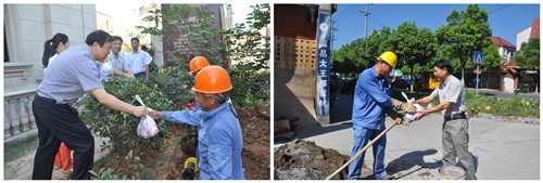 7月17日上午,星空(中国)公司党委副书记、纪委书记高小林、副总经理王嘉贤在公司领导的陪同下,到城区唯美品格紫薇园和紫郡花园工地现场慰问供水一线职工,送上防暑慰问品,并叮嘱大家在高温酷暑下作业要注意做好防暑措施。