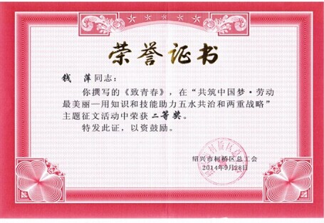由柯桥区总工会举办的“共筑中国梦 ·劳动最美丽----用知识和技能助力五水共治和两重战略主题征文比赛中,滨海供水公司钱萍同志的《致青春》荣获二等奖。