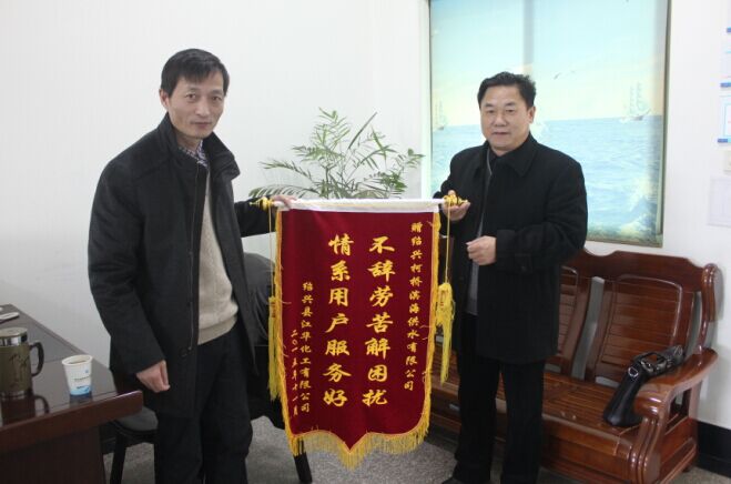 11月30日,绍兴江华化工有限公司负责人来到公司,送来 “不辞辛劳解困扰,情系用户服务好”的锦旗,对滨海供水公司长期以来为企业解决难题,营造良好的供水环境,提供高效的服务支持过程中表现出来的管理高水平、人员高素质、工作高效率表示深深感谢。